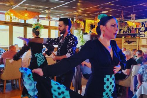 Los sábados hay actuaciones autenticas de flamenco del Grupo de Manuel Alcaide, compuesto por el bailaor Manuel Alcaide, dos bailaoras, cantaor y guitarrista. Los jueves actúa el Grupo Azabache compuesto por un guitarrista, una cantaora, un bailaor y una bailaora. Los martes el elenco flamenco incluye un percusionista (cajón) / cantaor acompañado por un guitarrista y una bailaora. El espectáculo de aproximadamente una hora tiene lugar en la zona principal del comedor donde los espectadores podrán disfrutar de una vista cercana de los artistas. Para grupos de cincuenta o más personas también se puede ofrecer espectáculos flamencos privados, con una serie de opciones que se adaptan a grupos para celebrar eventos especiales, o simplemente para cena o tapas.