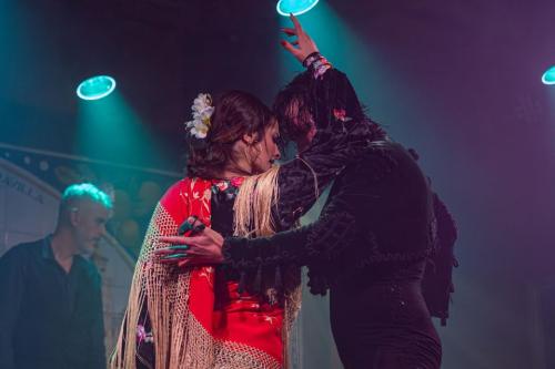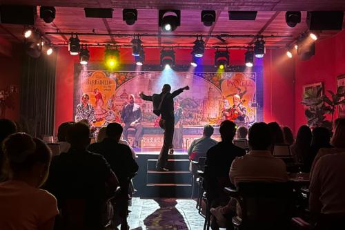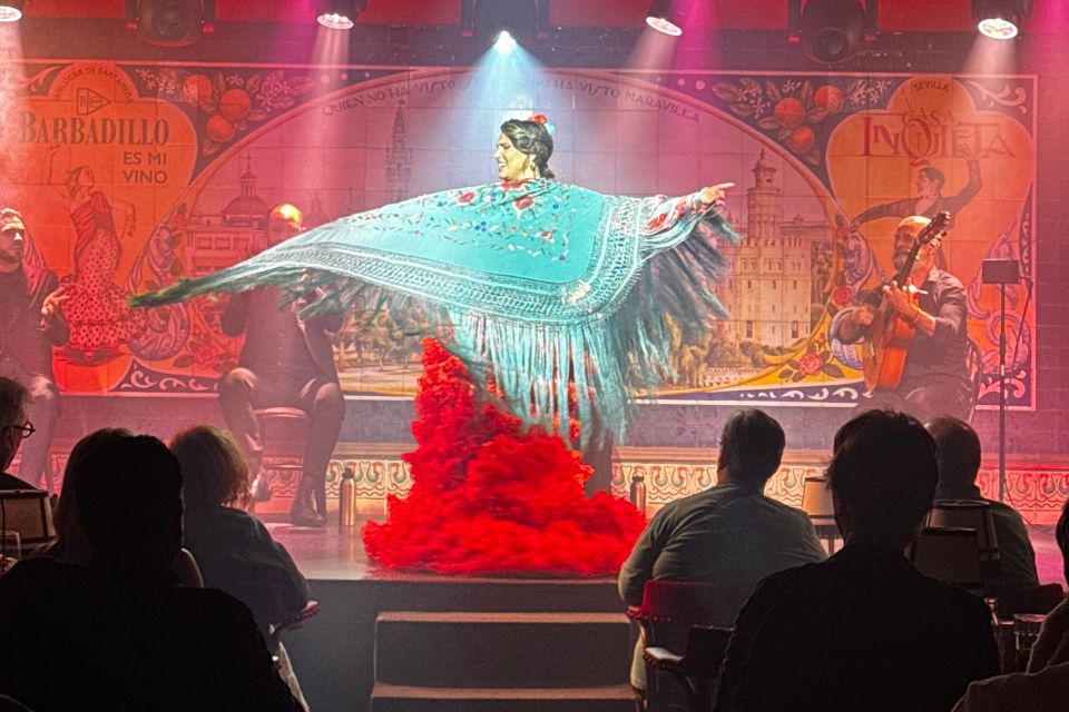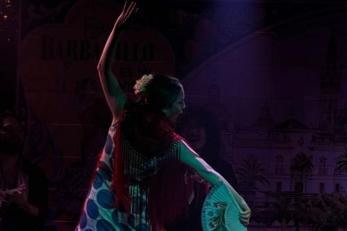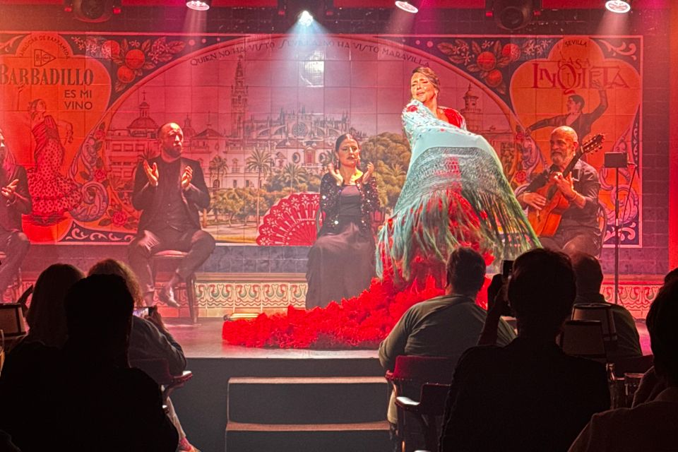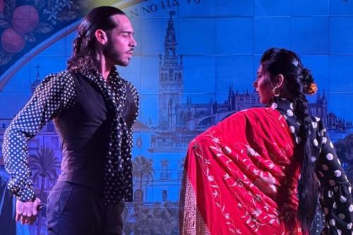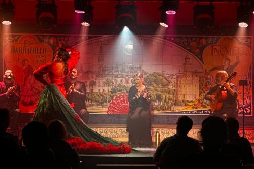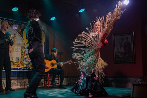 El tablao ofrece un hermoso espectáculo a mano de los talentosos representantes del panorama flamenco sevillano de hoy día. La sala llena de azulejos y detalles típicos para la estética andaluza, se convierte en un marco perfecto para una experiencia completa de una apasionada noche flamenca con cante, baile y guitarra.